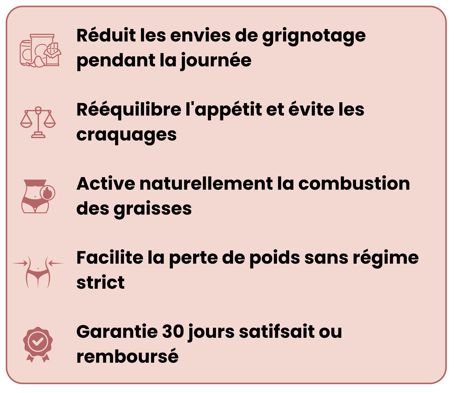La perte de poids durable ne vient pas de la restriction, mais du contrôle de l’appétit. Quand votre corps arrête de réclamer du sucre ou de la nourriture "par réflexe", vous reprenez le contrôle sans vous battre contre votre corps.